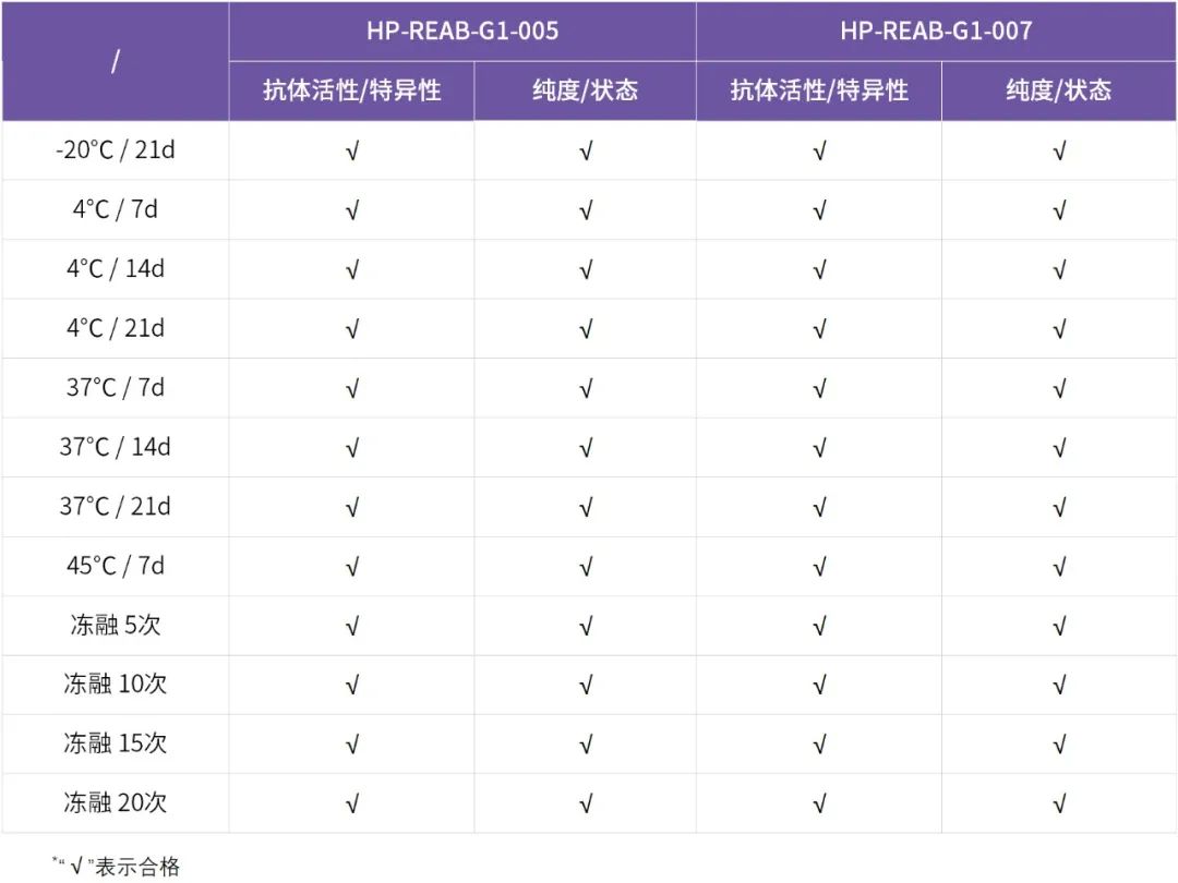 經(jīng)-20℃、4℃、37℃考核 21天,45℃考核7天,反復(fù)凍融20次考核后,對(duì)菲鵬生物兩株抗體HP-REAB-G1-005和HP-REAB-G1-007性能進(jìn)行評(píng)估,結(jié)果顯示:兩株抗體活性均未出現(xiàn)下降的情況,表明以上抗體穩(wěn)定性良好。