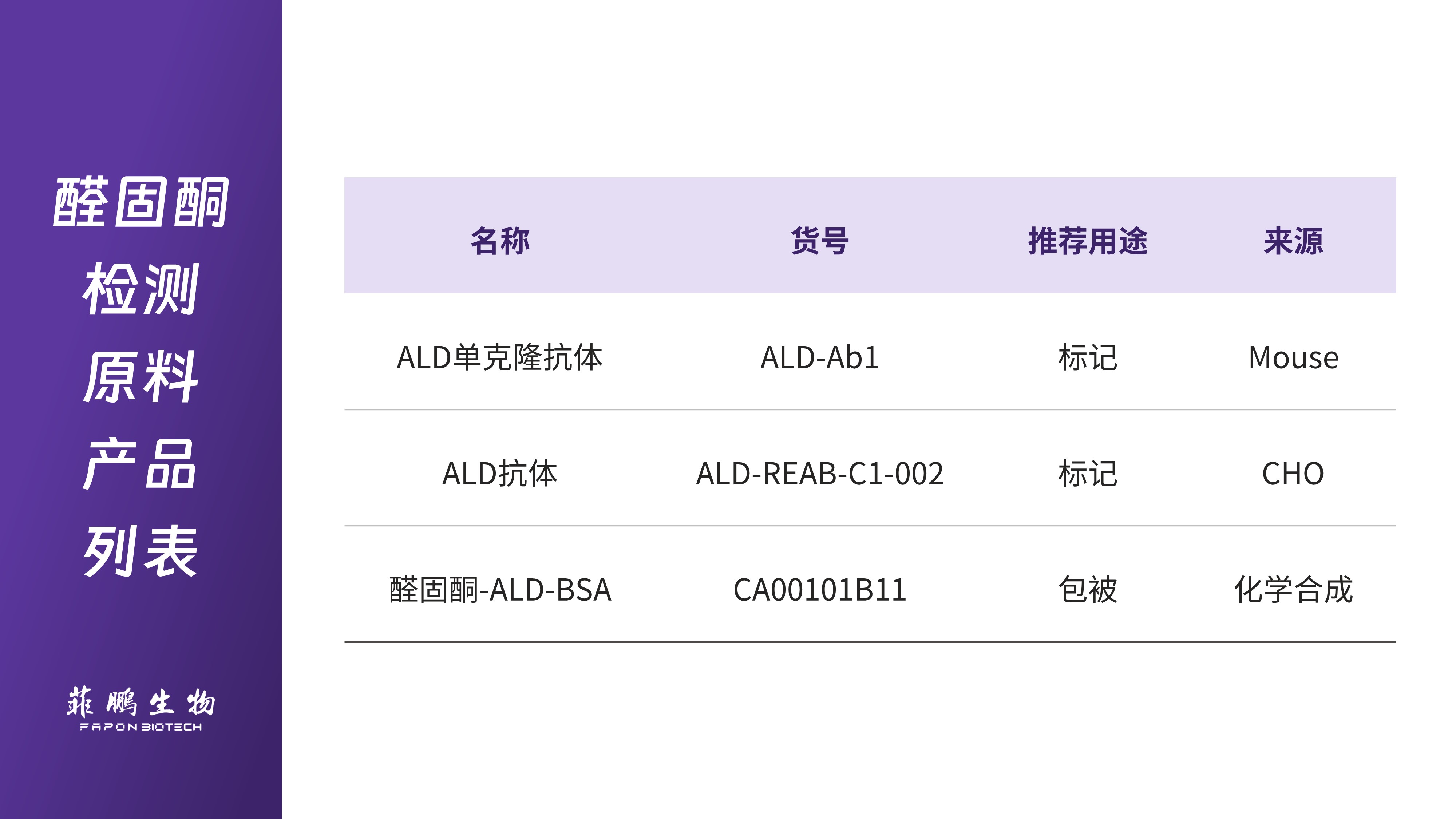 菲鵬生物已推出醛固酮、腎素、皮質(zhì)醇項(xiàng)目核心檢測(cè)原料,可提供核心抗體、抗原及解離劑等全套產(chǎn)品,臨床相關(guān)性及特異性表現(xiàn)優(yōu)異。