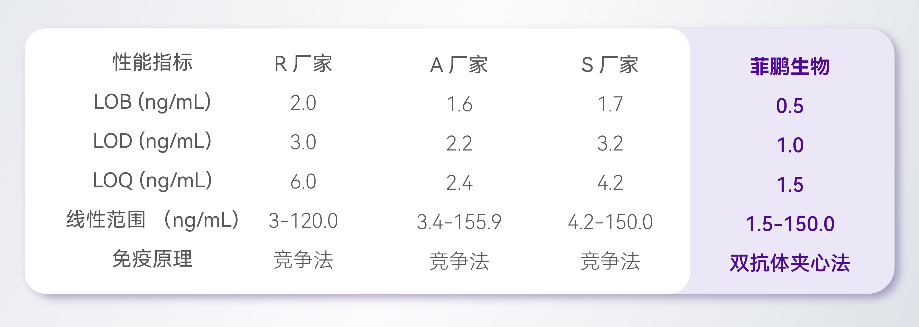 與市場上主流競爭法試劑相比,菲鵬生物 25-OH VD 試劑解決方案在關(guān)鍵性能指標(biāo)上展現(xiàn)顯著優(yōu)勢:
