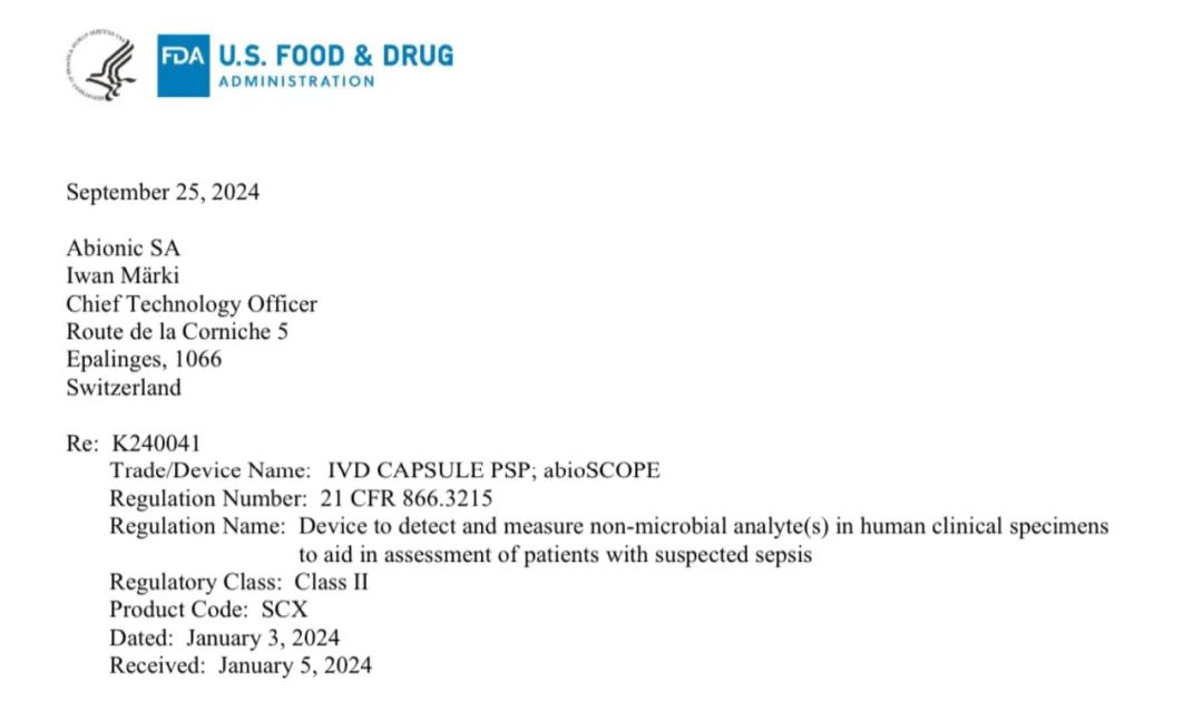 近日,菲鵬生物戰(zhàn)略合作伙伴——瑞士Abionic公司官宣其膿毒癥早檢試劑IVD CAPSULE PSP獲得美國食品藥品監(jiān)督管理局(FDA)510(k)許可。該產(chǎn)品此前已于2017年獲得歐盟CE認證,于2022年7月獲得歐盟IVDR認證,并于2023年1月獲得澳大利亞醫(yī)療用品管理局(TGA)認證。