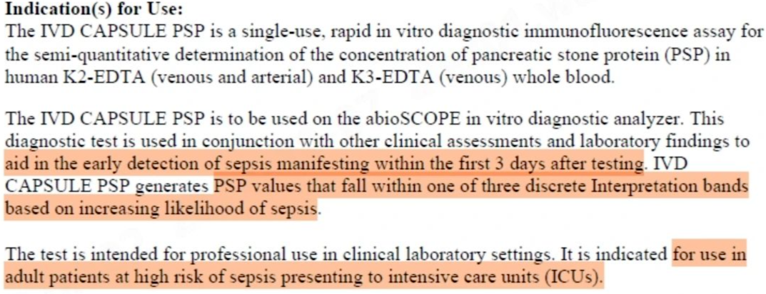 經(jīng)查詢相關(guān)醫(yī)療器械產(chǎn)品注冊數(shù)據(jù)庫,顯示IVD CAPSULE PSP是目前全球首個獲批應(yīng)用于膿毒癥早檢(Early detection of sepsis)的IVD試劑產(chǎn)品。