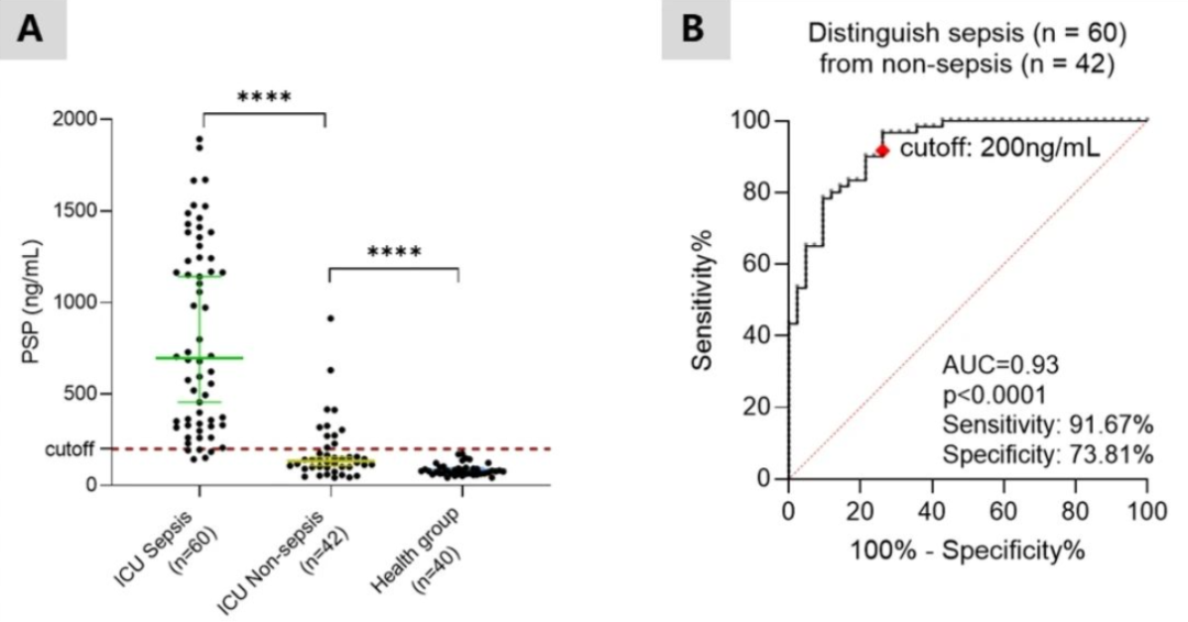 胰石蛋白(PSP)作為膿毒癥快速診斷標志物的性能分析:(A)ICU-膿毒癥組、ICU-非膿毒癥組及健康人對照組的血漿胰石蛋白(PSP)水平存在顯著差異;(B)ROC曲線分析,胰石蛋白(PSP)對膿毒癥快速診斷的AUC=0.93。