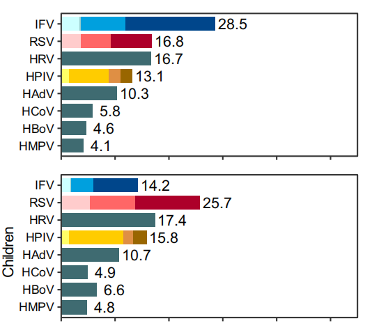 中國CDC于2021年在Nature Communications上發(fā)表了一項研究,通過對2009-2019年間全年齡段的急性呼吸道感染(ARI)患者進行監(jiān)測,分析了231,107名合格患者的病原學(xué)和流行病學(xué)特征。結(jié)果表明,流感病毒(IFV)、RSV和人鼻病毒(HRV)是最主要的三大病毒性病原體,而在兒童群體中,RSV則位居第一。