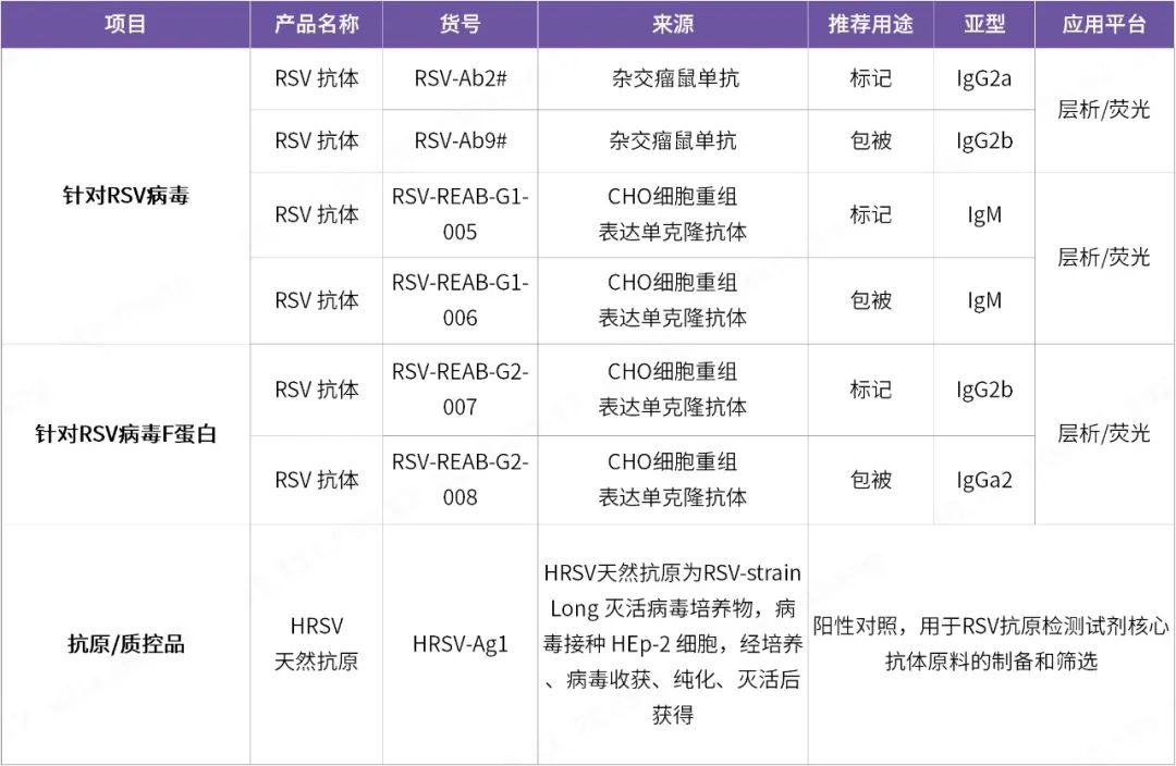 近期,菲鵬生物最新開發(fā)了針對RSV N蛋白、F蛋白的高質(zhì)量單克隆抗體,以及配合人呼吸道合胞病毒(Human respiratory syncytial virus,HRSV)的天然抗原質(zhì)控品,以期為IVD試劑伙伴加速開發(fā)優(yōu)質(zhì)的RSV診斷試劑盒保駕護航。