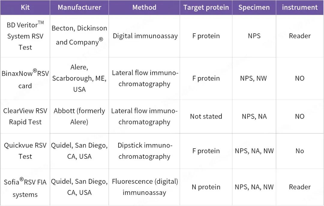 抗原檢測方法的靈敏度雖不及培養(yǎng)或核酸擴增,但由于用時較短(10-15分鐘)的優(yōu)勢, 一般適用于急診的檢測場景,尤其是針對嬰幼兒人群,能夠起到及時阻斷病毒傳播的作用。目前國際上多家RSV快速抗原診斷試劑盒(RADTs)均已獲得美國臨床實驗室改進修正案(CLIA)的豁免,即非醫(yī)務(wù)人員也可自行使用和測試。在這些RADTs中,N蛋白和F蛋白的檢測標(biāo)靶均可見,采用的樣本類型一般兼容鼻咽拭子(NPS)、鼻咽吸取物(NPA)和鼻腔洗液(NW) ,其中NPS長期以來被認為是首選的樣本。為提高RSV抗原檢測的敏感性和特異性,其中兩種商業(yè)上可用的橫向流動測試還配備了數(shù)字掃描儀,詳見下表: