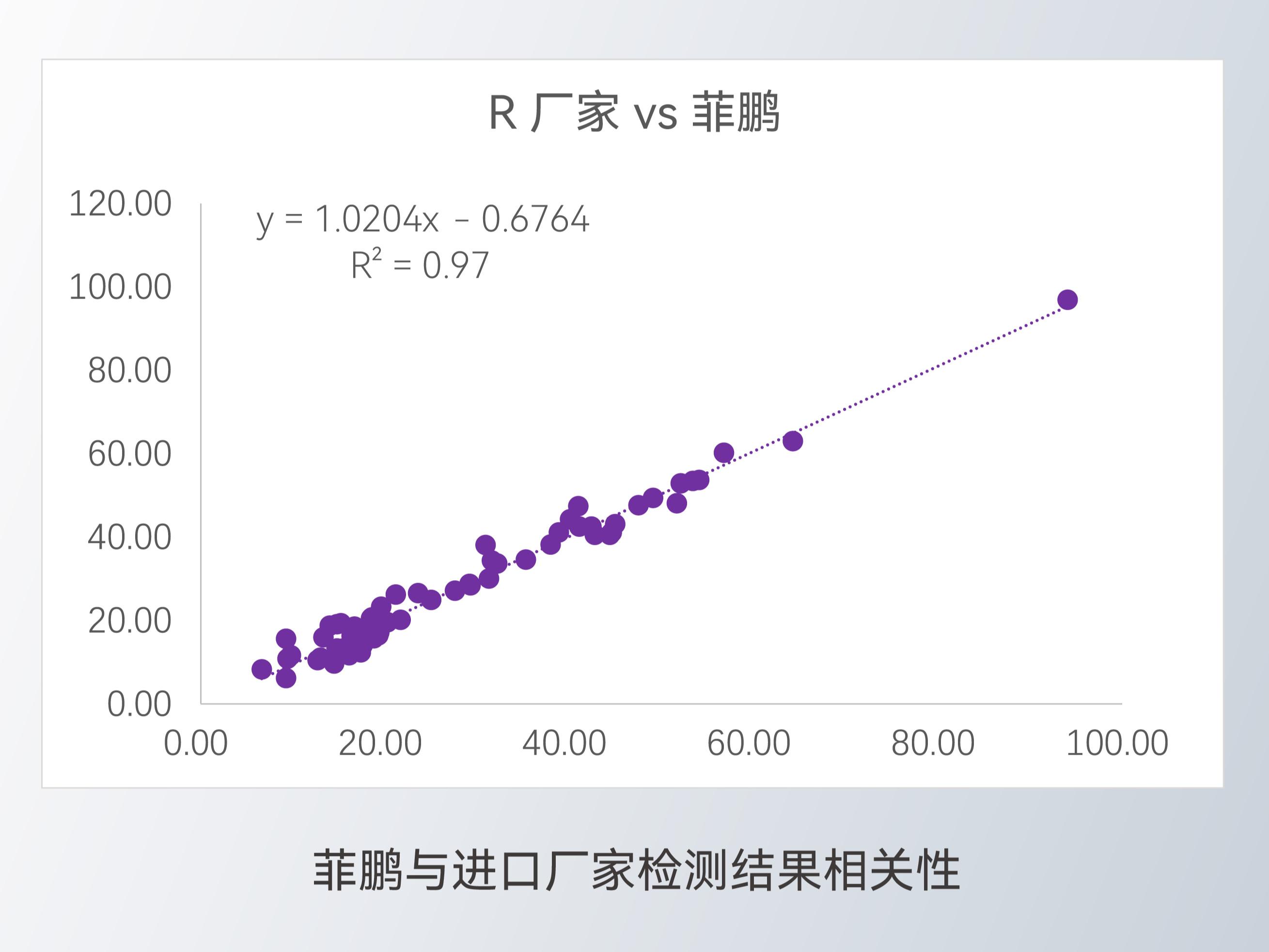 經(jīng)過嚴(yán)格驗證,菲鵬生物 25-OH VD 試劑解決方案性能與參考方法(如液相色譜串聯(lián)質(zhì)譜法 LC-MS/MS)及國際主流進(jìn)口試劑品牌具有良好的一致性和相關(guān)性。