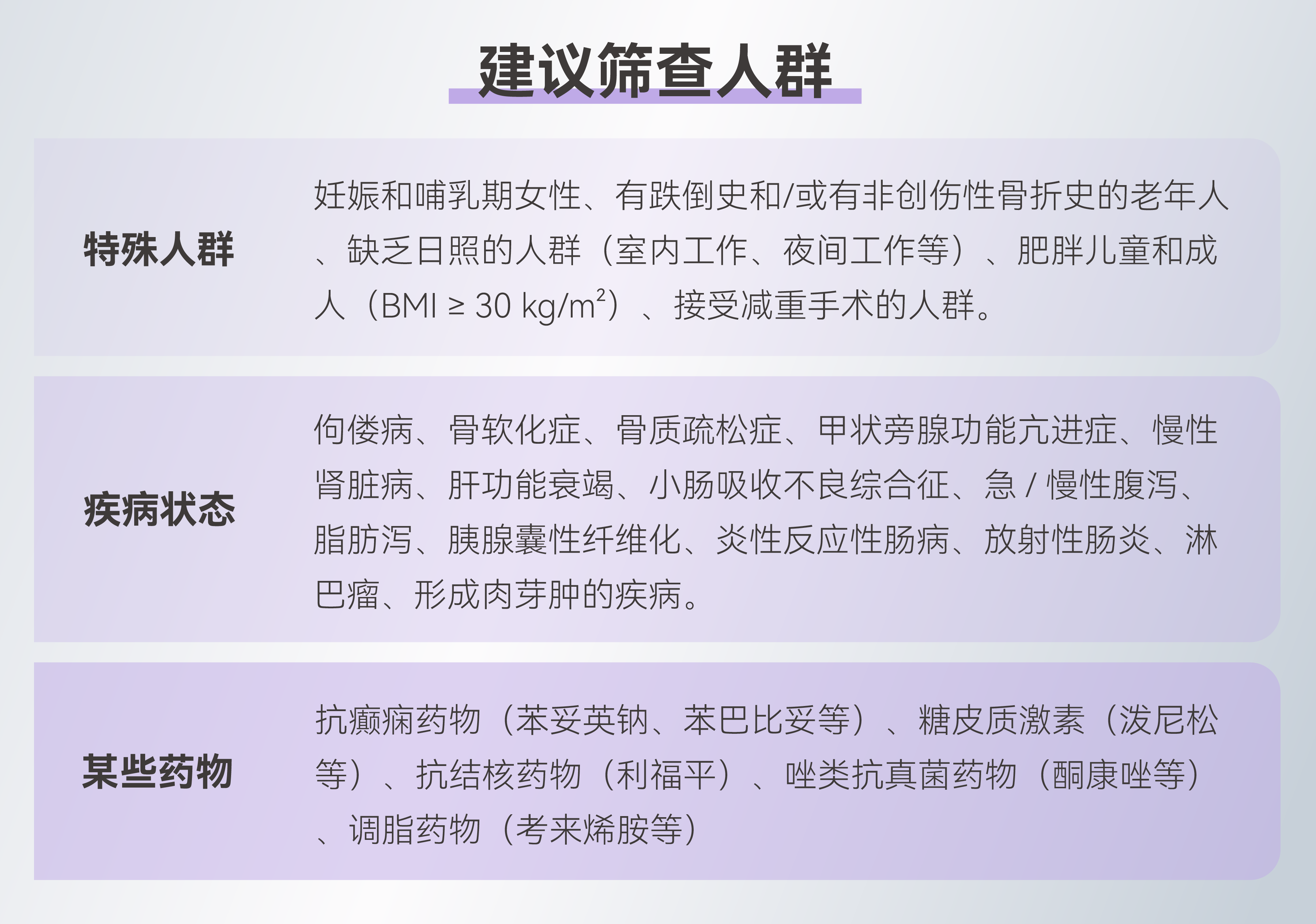 雖然維生素 D 缺乏普遍,但《維生素 D 及其類似物臨床應(yīng)用共識》等指南并不推薦對普通人群進(jìn)行普遍篩查。應(yīng)重點關(guān)注具有缺乏風(fēng)險因素或需維持合理維生素 D 水平的人群: